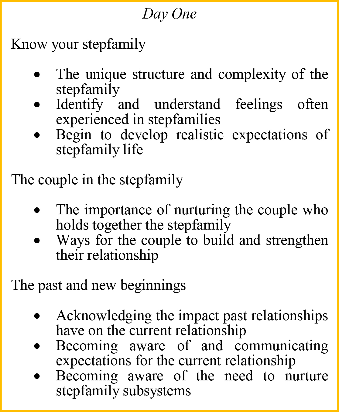Each participant will be provided with new strategies for coping with the difficult stepfamily dynamics and relationships. At the same time we will promote and practice the art of acceptance of each individual’s current and prior situation no matter how complex or difficult these are.